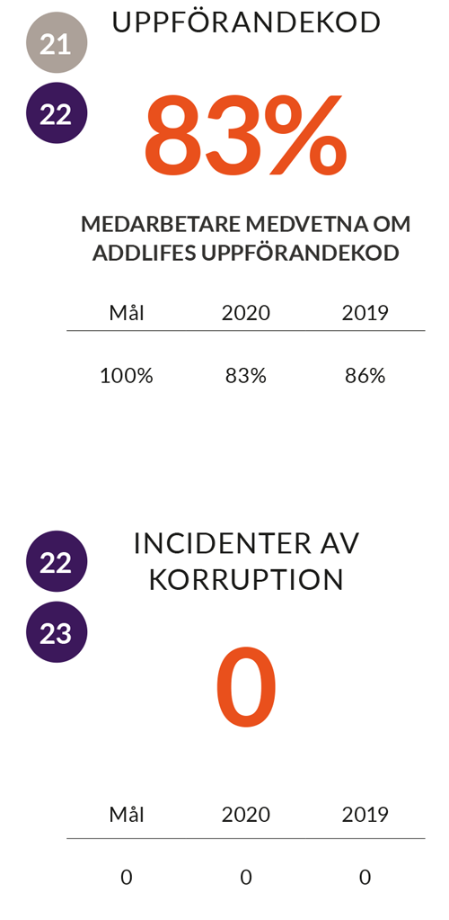 AddLifes målsättning är att 100 % av alla medarbetare ska vara medvetna om AddLifes uppförandekod. Vi har dessutom en visselblåsarfunktion så eventuella missförhållanden kan rapporteras anonymt. Under 2020 har det inte inkommit någon anmälan via vår visselblåsarfunktion.