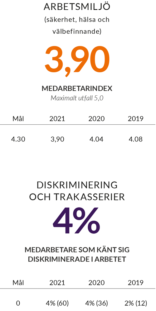 Vi genomför medarbetarundersökningar för att identifiera förbättringsområden på koncernnivå, i dotterbolagen och i arbetsgrupper. I årets medarbetarundersökning svarade 1 512 personer (84%), jämfört med 828 personer (85%) 2020. På varje företag görs en prioritering av aktiviteterna efter arbetsplats. Undersökningen följer också upp medarbetarindexet, ett viktigt hållbarhetsmål som mäter arbetsmiljön med avseende på hälsa, säkerhet och välbefinnande.