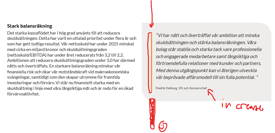 ”Under 2025 fortsatte den positiva resultatutvecklingen i våra bolag, i linje med de prioriteringar vi etablerat. Vi har nått och överträffat vår ambition att minska skuldsättningen och stärka balansräkningen.”