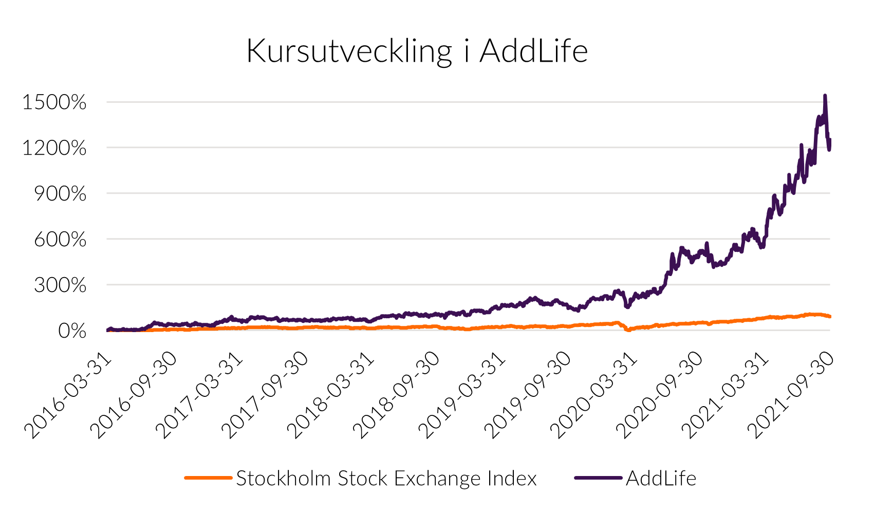 Antalet återköpta aktier uppgår till 498 749 B-aktier motsvarande 0,4 procent av totalt antal aktier och 0,3 procent av röstetalet. Det genomsnittliga anskaffningspriset för återköpta aktier uppgår till 52,12 SEK per aktie. Antalet innehavda egna aktier uppgick under delårsperioden i medeltal till 1 029 367 (2 271 999). Aktiekursen per 30 september 2021 uppgick till 321,20 SEK och den senaste betalkursen för AddLifeaktien den 21 oktober 2021 var 343,00 SEK.