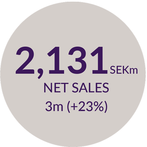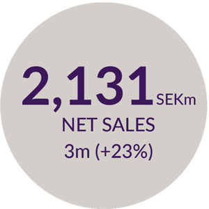 - Net sales increased by 23 percent to SEK 2,131m (1,731), of which acquired growth amounted to 35 percent. The organic sales decreased by 12 percent, but excluding net sales related to COVID-19, organic growth amounted to 3 percent.