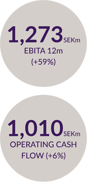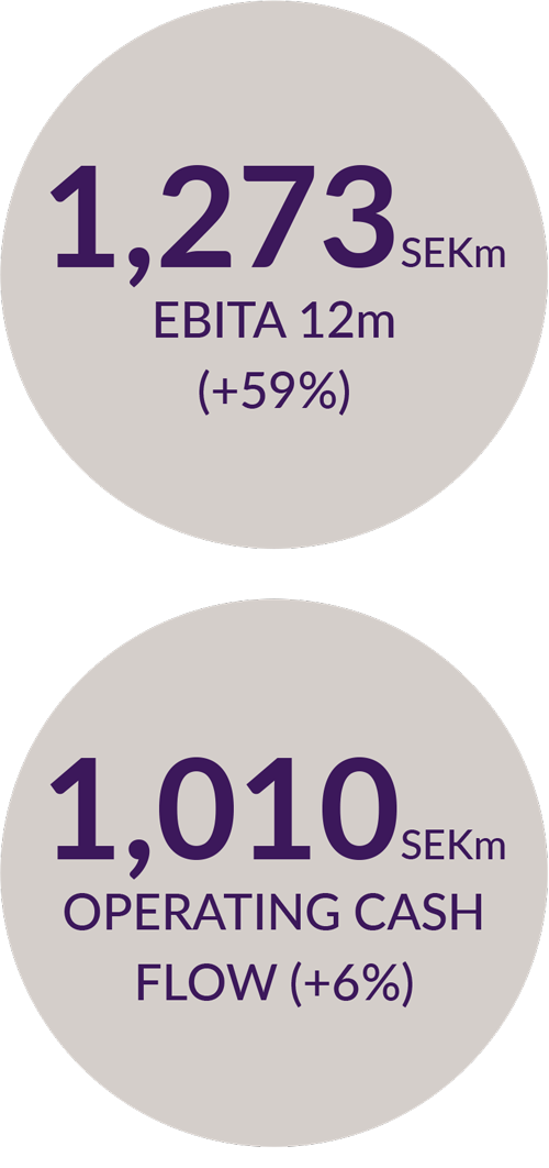 - EBITA increased by 59 percent to SEK 1,273m (802), corresponding to an EBITA-margin of 15.9 percent (15.2).